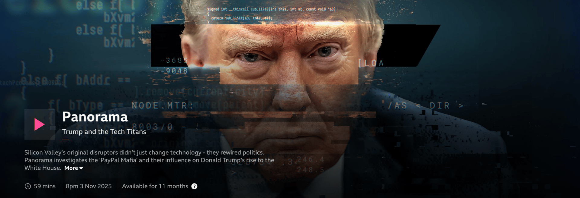 Also, I reckon BBC’s recent Panorama was more scary than any Halloween film, granted it was the same program makers that were found to be cutting together Trump’s “fight like hell” speech for journalistic effect which did not go down well with anyone. But the reporting here was clear: the tech bros of Silicon Valley (I’ll probably be one one day, but more like a tech bro filmmaker from the Brixton South London, know what I mean?) have managed to wang their way to the top of the political system and the outlook doesn’t look that rosy for any of us. Definitely worth a watch.